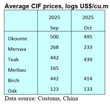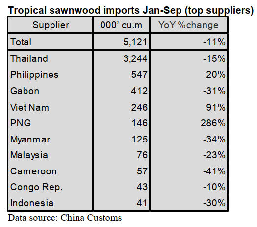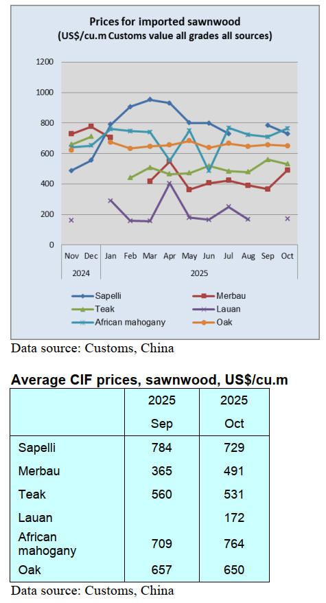 The CIF prices for tropical sawnwood fell 1% to US$287