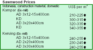 (US$ per Hoppus ton, FOB Yangon) are at $440 (East Bago area), $430 (West Bago area) and $410 (other areas). Pyinkado seems to perform better than gurjan, with MTE receiving new orders, despite the latest price increase. But generally, hardwood market conditions remain the same as in previous months.