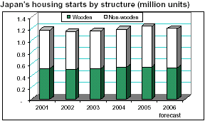 Wood based units were 542,859 or 44% of all built housing starts, up 0.4% from 2004. Of these, 2x4 units increased almost 6%, the fourth consecutive annual increase. In October, Japan’s Research Institute of Construction and Economy had forecast new housing