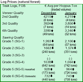 With its fiscal year coming to a close at the end of March, MTE raised the prices for direct sales of teak logs for the second time in February. Direct sales prices are at (US$ per hoppus ton FOB Yangon) $1,270-$1,697 for SG-4 grade, $999-$1,162 for SG-5 and $814-$890 for