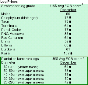 Log exports from PNG amounted to 195,511 m3 (US$12.31 million) in December, bringing total log exports to 2.28 million m3 ($138.6 million) in 2005. These figures were up 13.4% in volume and 16.5% in value from 2004. Saw/veneer grades accounted for 84% of the log exports. Main log export species were malas, taun, bintangor and terminalia. China took 75% of all log exports, followed by Japan (9.5%), Vietnam (6.4%) and Korea (5%). Of the saw/veneer log grades, China imported 84%, Japan 7.7%, Korea 3.4% and Vietnam 1.6%. For plantation species, kamarere remained the main export species primarily to the markets of Vietnam, Japan, China and Korea.