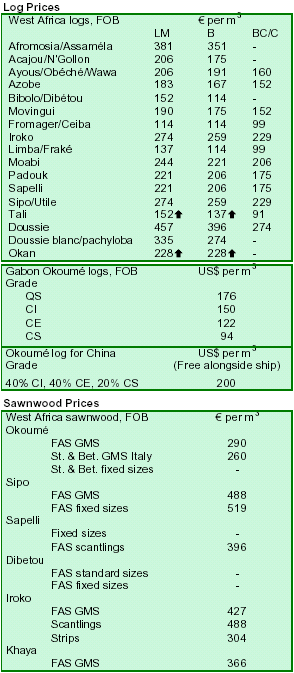 Gabonese log exporters remain busy with a number of species for China and India plus the usual strong and growing demand for okoume and ozigo. The SNBG continues the State monopoly on exports of okoume and ozigo, which has kept prices steady to the relief of many exporters who had feared a price war. Government proposals for a new log quota system and other controls have been postponed until July to give time for companies to reorganize and establish the required down-stream processing facilities.