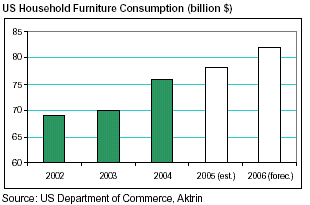 US household furniture consumption was weak during the first three years of this decade, grew 7.9% in 2004 and 3.8% last year. Based on the above economic fundamentals, Aktrin forecast a faster growth rate of 4.3% in 2006, bringing the market value of household furniture to about $82 billion.