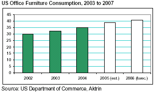 After showing mixed trends in the first four years of this decade, business outlays for office furniture (evaluated at end-user prices and including recycled furniture) rose 11.4% to an estimated $38.8 billion in 2005. With most of the pent-up demand being satisfied now, Aktrin predict growth to slow to 4.5% in 2006. This would bring this year's market size to a value in excess of $40 billion for the first time.