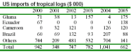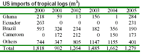 US imports of tropical log stood at only 1,279 m3 ($662,000) in 2005. This is comparatively small with US imports of tropical lumber which amounted to almost 355,000 m3 ($252 million) in 2004. US tropical log imports have been on a log-term downward trend for several years. Both the volume and value of tropical log imports in 2005 were 30% down from 2000 (1,818 m3 worth $942,000).