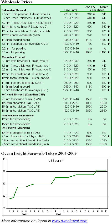 Total supply of plywood in the Japanese market was 689,000 m3 in January, up 16.1% from December but down 1.9% from January 2005. Japanese imports of plywood (regular and special plywood and block board) rose to 446,000 m3 in January, up 38% from December.