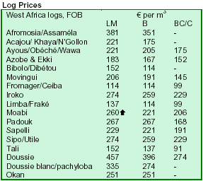 Demand for West African timber products remained firm but prices were stable in late April. Moabi LM was the exception, with prices rising .6 to .260 per m3. India and China remained very active in the market. The continued low log supply from Southeast Asia is giving West African exporters every incentive to push prices steadily higher.