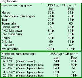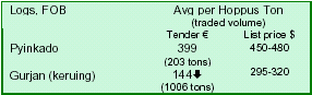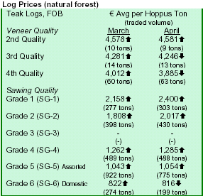 April is normally a quiet month in terms of new sales, as it is the beginning of the new financial year. However, teak logs remained in good demand and prices held firm. Fresh gurjan (keruing) logs coming out from the forests continued to be sold without much difficulty, but remained dependent on the availability of keruing from Malaysia and Indonesia. Nevertheless, the sealed tender average price in April was not promising as it was lower than that in March.