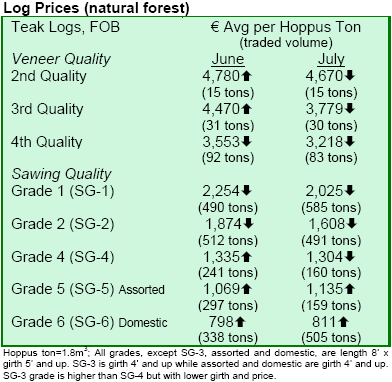 The volume of teak contracts approved (notably for the Indian market) declined drastically from 21,850 m3 to