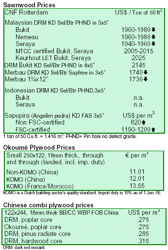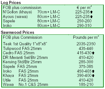 tropical sawnwood. An expected 9-10% increase in okoume plywood prices did not materialize probably due