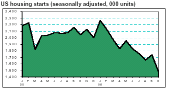 Privately-owned housing starts fell sharply 14.6% in October to a seasonally adjusted annual rate of 1.49