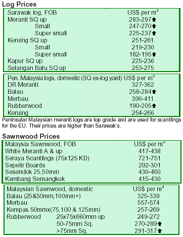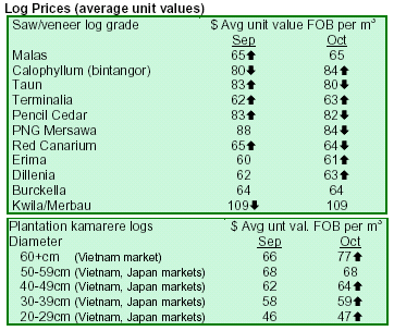 supply. China and India are active log buyers. Although rains persist in some areas, the short dry season is