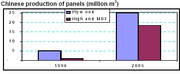density fibreboard (MDF) climbed 1,821% from 965,000m3 in 1996 to 18.54 million m3 in 2005 while that of