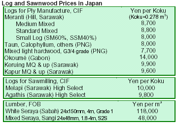 stalled. Importers are asking for ¥9,000 yen per koku CIF of Sarawak meranti regular logs arrived in last November