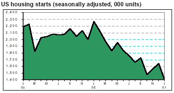 Privately-owned housing starts fell 14% in January to a seasonally adjusted annual rate of 1.41 million units, according to the US Commerce Department. This was the