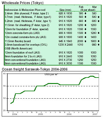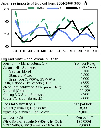 Imports of tropical logs by Japan fell 30% to 98,329 m3 in December. Japanese imports of tropical logs have been mostly declining since September due to Ramadan and New Year festivities, after growing for most of the year since March 2006, helped by stronger prices (see chart). Overall, total Japanese imports of tropical logs amounted to 1.37 million m3 in 2006, a mere 0.1% up from 2005. Log imports in 2006 came from Malaysia (78.3%, over two-thirds of which from Sarawak), PNG (13.8%), Solomon Isl. (7.7%) and Africa (0.5%). Tropical log exports to Japan were anticipated to decrease in early 2007 due to reduced supply during the Chinese Lunar New Year festivities.