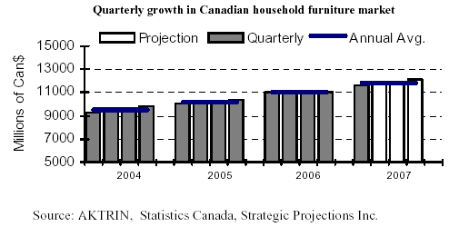 Canada expects lower growth of household furniture market This third article of a four part series covers trends in the Canadian household furniture market. The business sector in Canada is performing better than in the US. GDP has been progressing at a rate of 2.8% in 2006. However, the economy will likely lose speed this year, advancing at an anticipated rate of 2.5%. Personal income growth advanced at a healthy pace of 6.1% in 2006. In conjunction with the US economic slowdown, it will decelerate to about 5.0% over the next two years. Much of the growth was due to higher prices. Growth of real disposable income in 2006 was 4.9%. Growth will be much slower in 2007 and 2008, estimated to be only 3.9% and 2.9% respectively. This modest performance will occur despite the promised income tax cuts by the government.