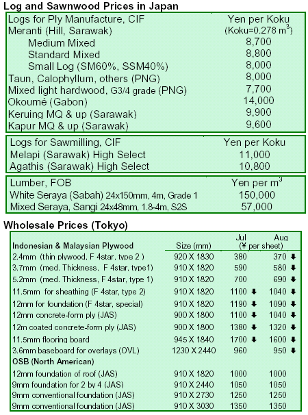 price reductions of logs. Malaysian plywood mills have reduced log purchases, since there has been weakening demand from