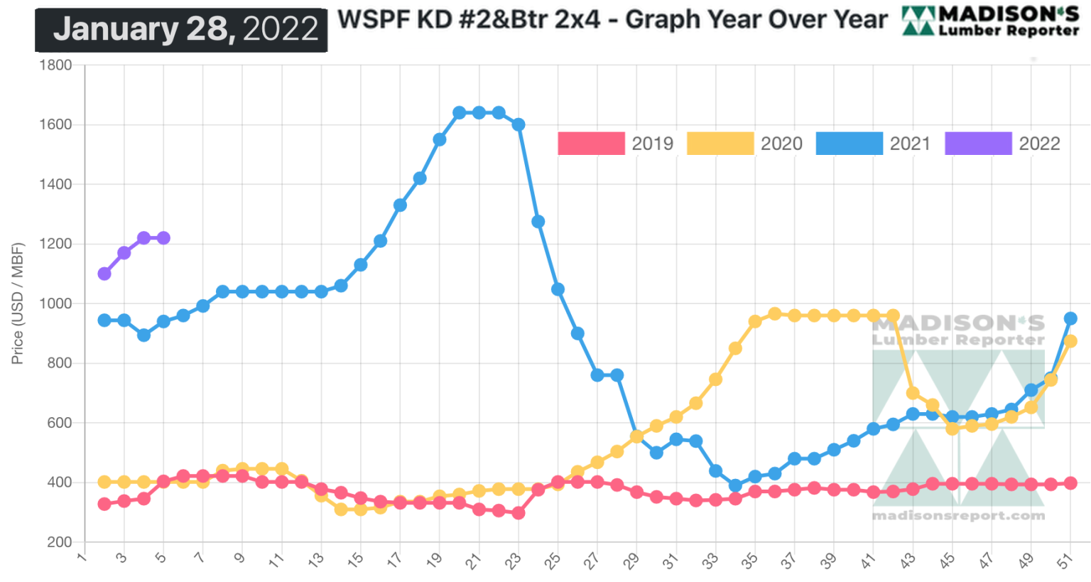 week ending January 28, 2022, the price of Western S-P-F 2×4 was up by