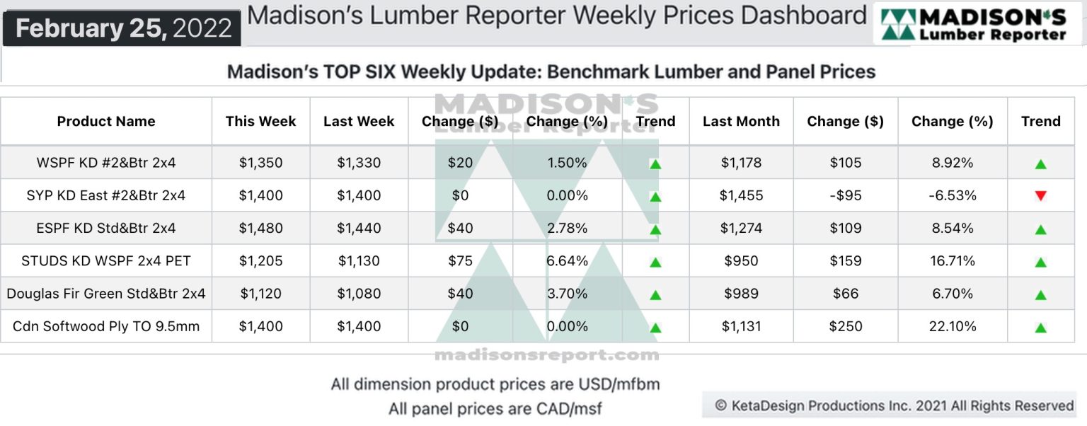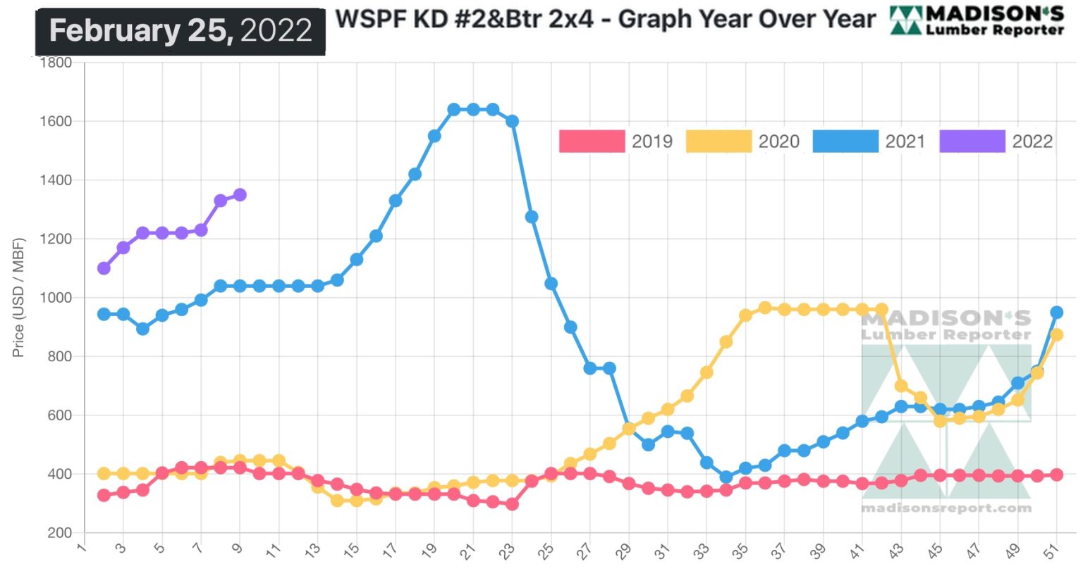 After a big pop the previous week, for the week ending February 25, 2022 the price of benchmark softwood lumber item Western Spruce-Pine-Fir 2×4 #2&Btr KD (RL) was US$1,350 mfbm. This is up by +$20, or +2%, from the previous week when it was $1,330, said forest products industry price guide newsletter Madison’s Lumber Reporter. That week’s price is up by +$173, or +15% from one month ago when it was $1,178.
