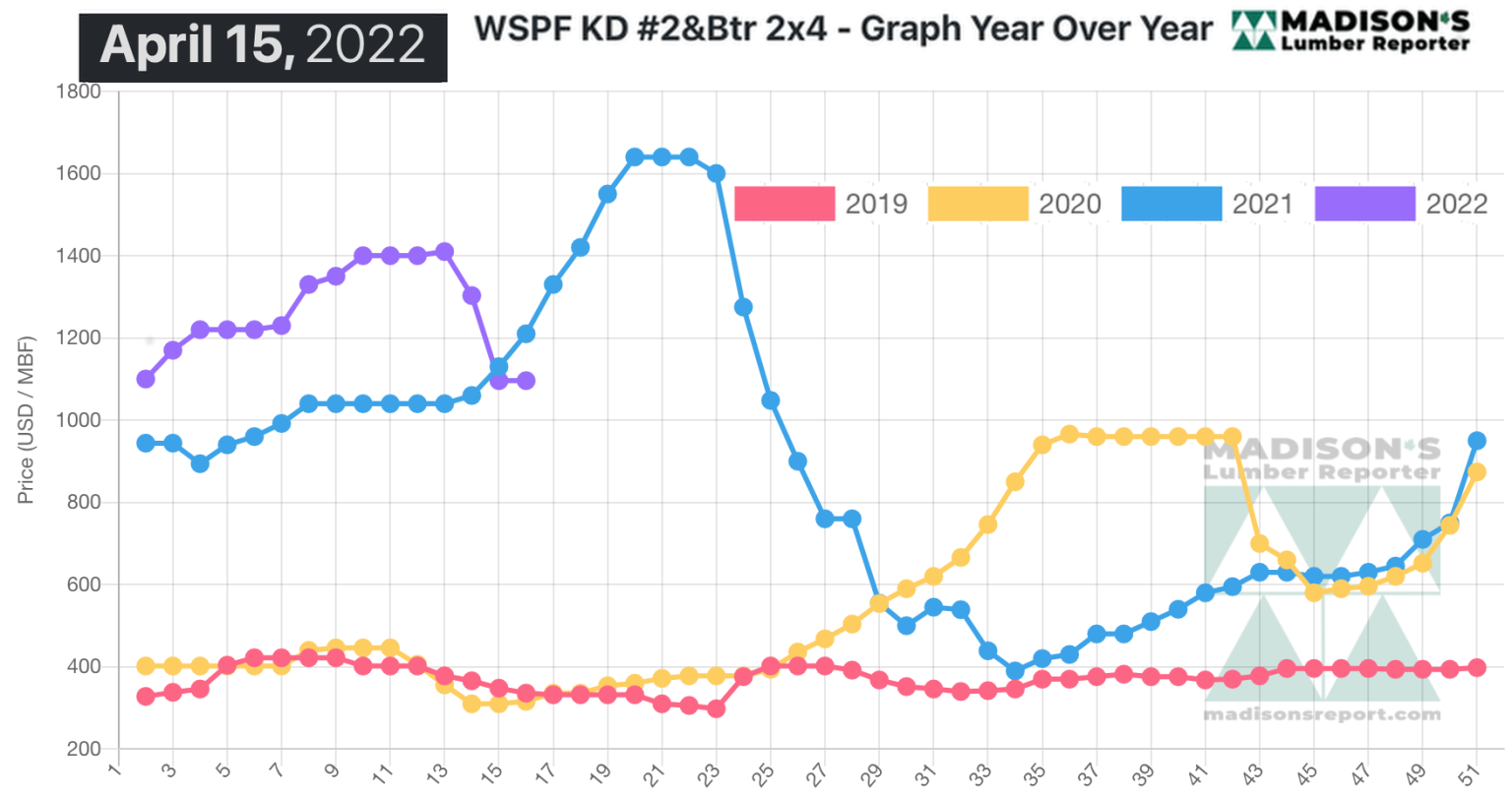 week ending April 15, 2022 the price of Western Spruce-Pine-Fir 2×4 is