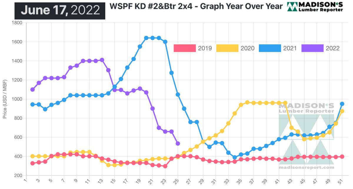 price of Western Spruce-Pine-Fir 2×4 #2&Btr KD (RL) for the week of June