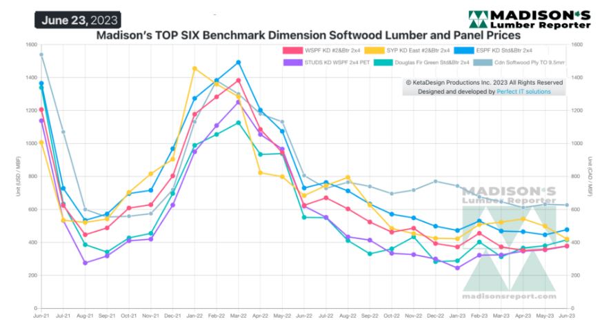 In the week ending June 23, 2023, the price of Western S-P-F 2×4 #2&Btr KD (RL)