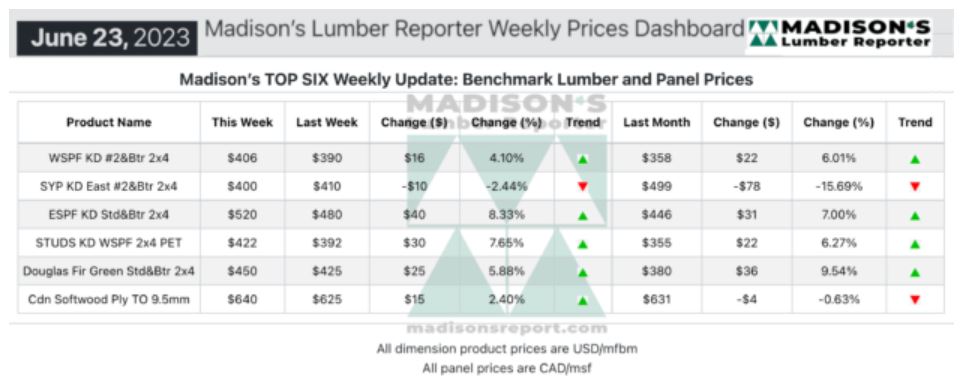 Madison’s Benchmark Top-Six Softwood Lumber and Panel Prices: Monthly