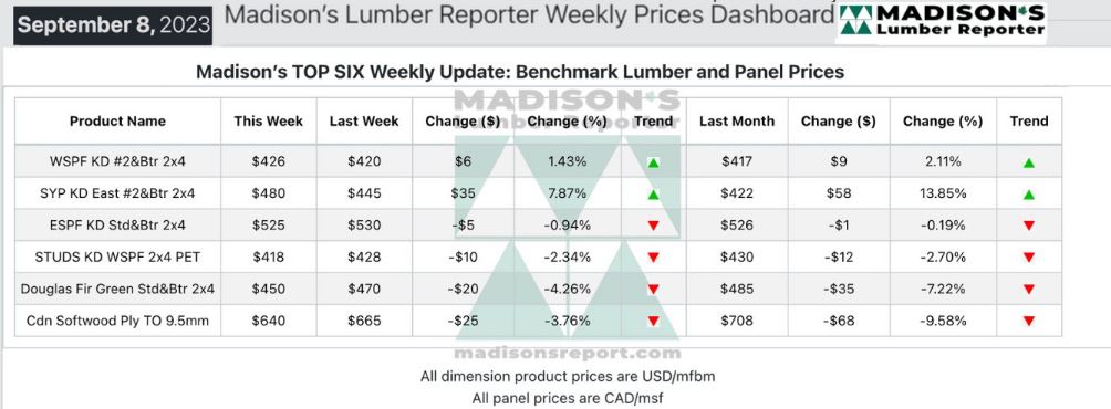 In the week ending September 8, 2023, the price of Western S-P-F 2x4 #2&Btr KD (RL) was US$426 mfbm, said forest products industry price guide newsletter Madison’s Lumber Reporter. This is up by +$6, or +1%, from the previous week when it was $420.