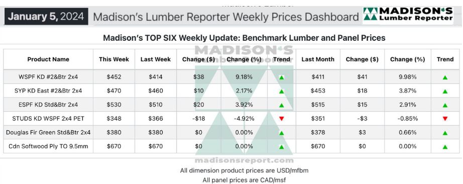 In the week ending Jan. 12, the price of Western S-P-F 2×4 #2&Btr KD (RL)