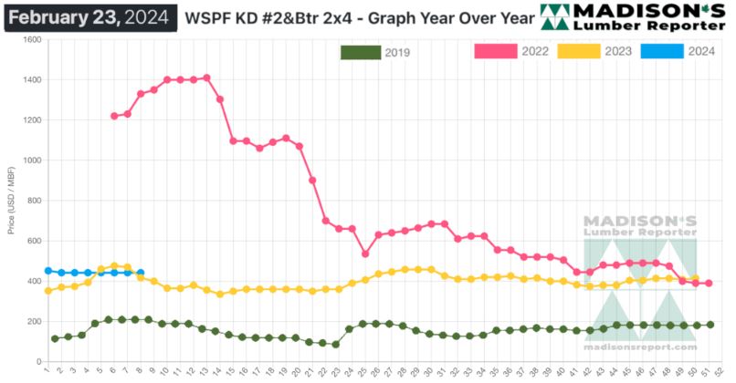 item Western Spruce-Pine-Fir 2×4 #2&Btr KD (RL) was US$442 mfbm. This is