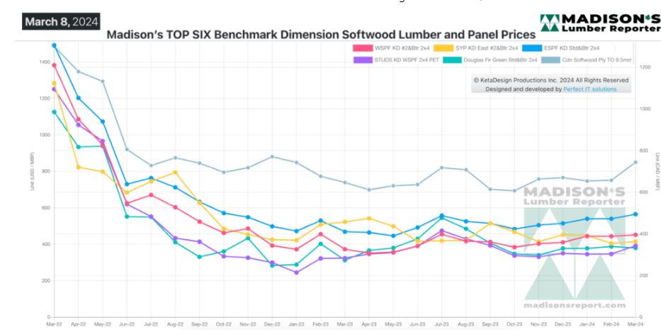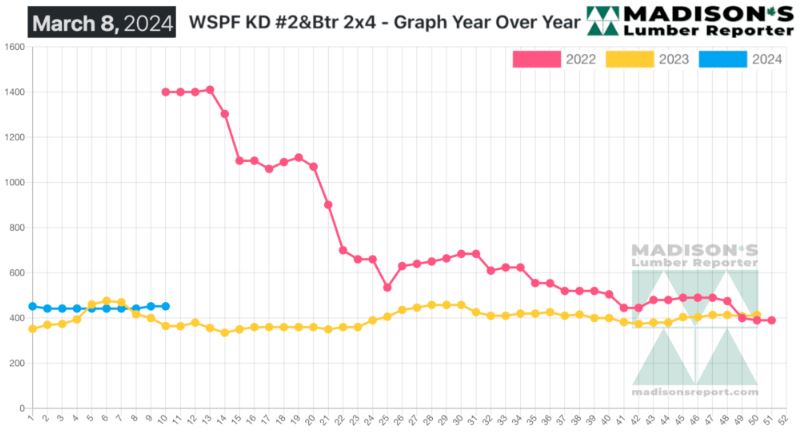 In the week ending March 8, 2024, the price of benchmark softwood lumber item Western Spruce-Pine-Fir 2×4 #2&Btr KD (RL) was US$452 mfbm. This is flat compared to the previous week when it was $452. That week’s price is up by +$8, or +2%, from one month ago when it was $444.