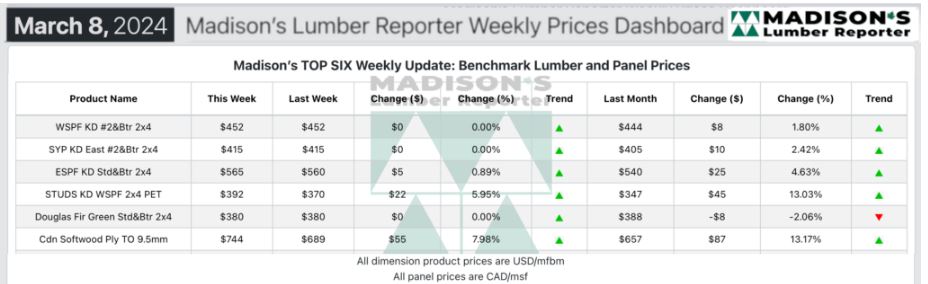 Suppliers of Western S-P-F lumber in Western Canada noted a strong uptick in inquiry and takeaway of all product lines. Prices of standard- and high-grade numbers were flat to slightly up, with sawmills showing confidence in their positions as overall supply was perceived to be limited. In what many called the busiest week for dimension lumber sales so far in 2024, sales of narrows led the charge.