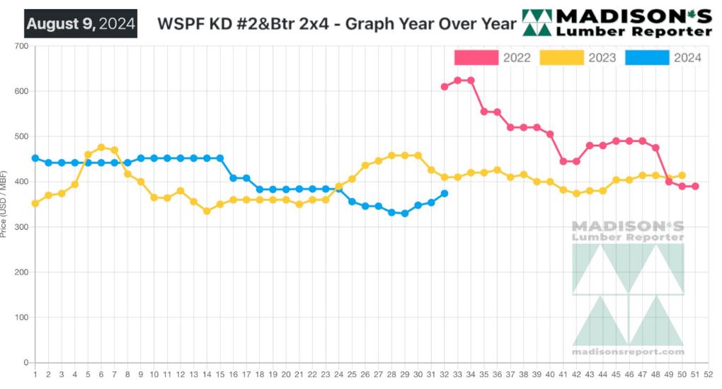 In the week ending August 9, 2024, the price of Western S-P-F 2x4 #2&Btr KD