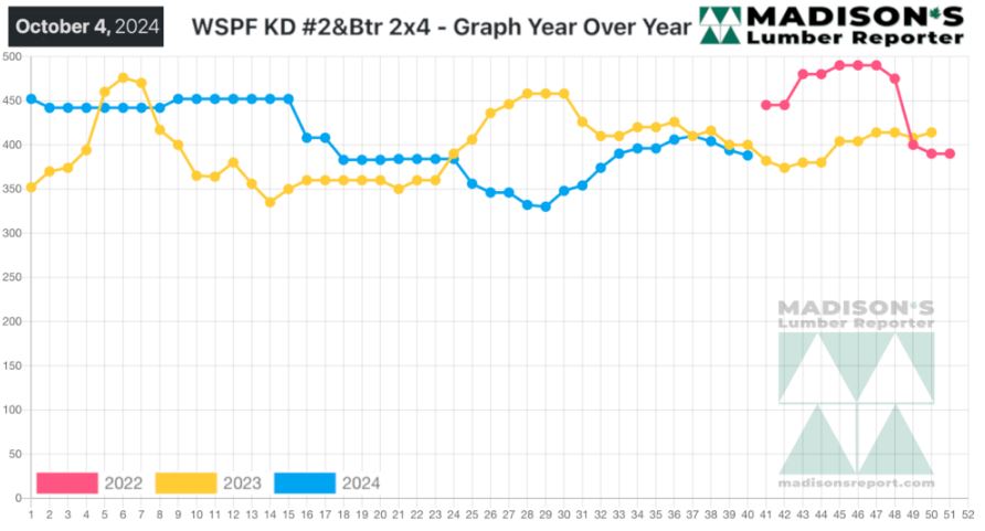 item Western Spruce-Pine-Fir 2×4 #2&Btr KD (RL) was US$388 mfbm. This is