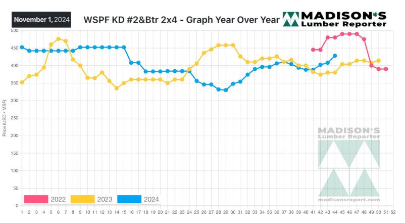 item Western Spruce-Pine-Fir 2×4 #2&Btr KD (RL) was US$428 mfbm. This is up