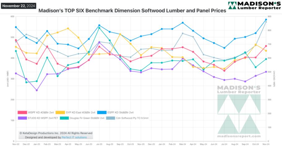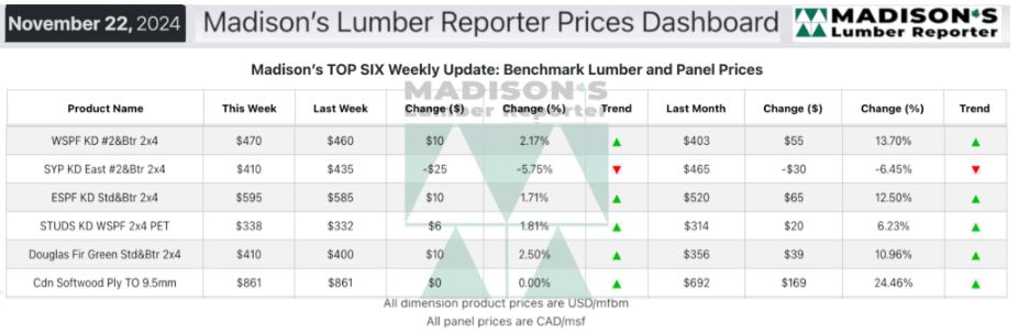 In the week ending November 22, 2024, the price of Western Spruce-Pine-Fir 2×4 #2&Btr KD (RL) was US$470 mfbm, which up +$10, or +2%, from the previous week when it was $460, said Madison’s Lumber Reporter.