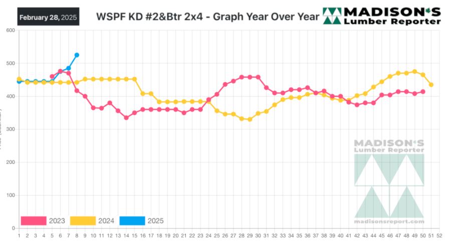 2×4 #2&Btr KD (RL) was US$525 mfbm, which is up +$40, or +8%, from the
