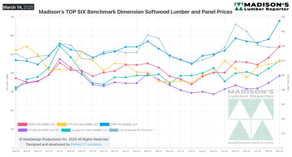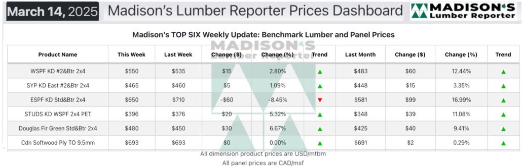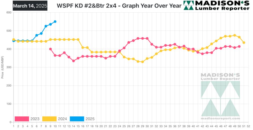In the week ending March 14, 2025 the price of Western Spruce-Pine-Fir 2×4 #2&Btr KD (RL) was US$550 mfbm, which is up +$15, or +3%, from the previous week when it was $535, said weekly forest products industry price guide newsletter Madison’s Lumber Reporter.