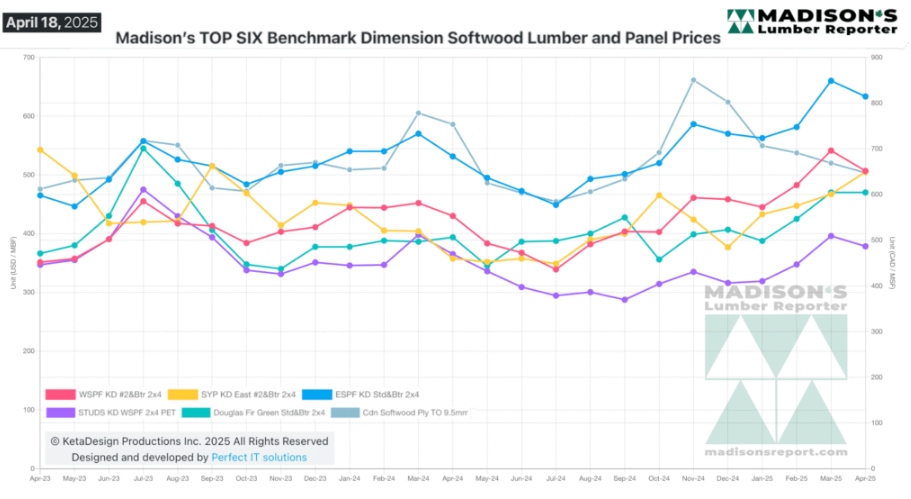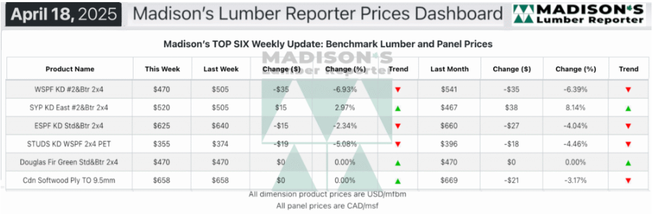 In the week ending April 18, 2025, the price of benchmark softwood lumber