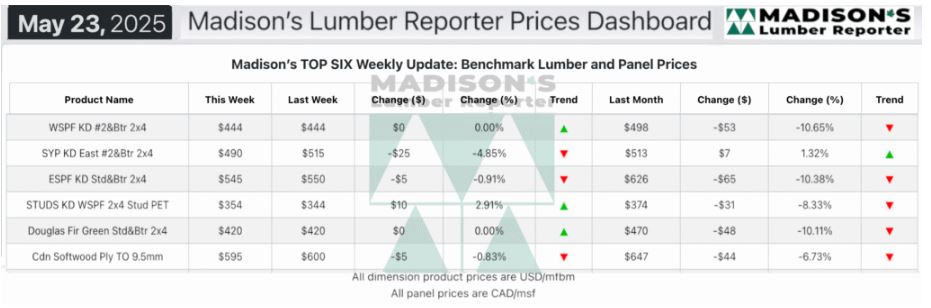 In the week ending May 23, 2025 the price of Western Spruce-Pine-Fir 2×4 #2&Btr