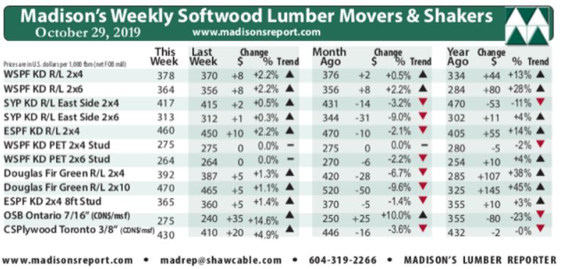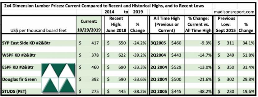 current October 2019 benchmark dimension softwood lumber 2×4 prices