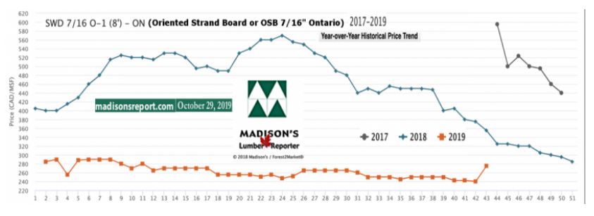 Prices of OSB 7/16” Ontario this week are up C$3 relative to the