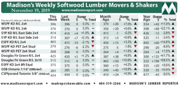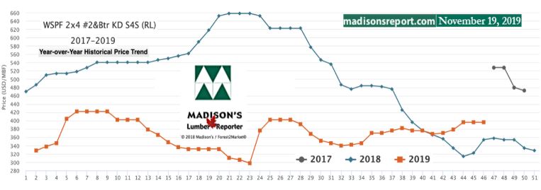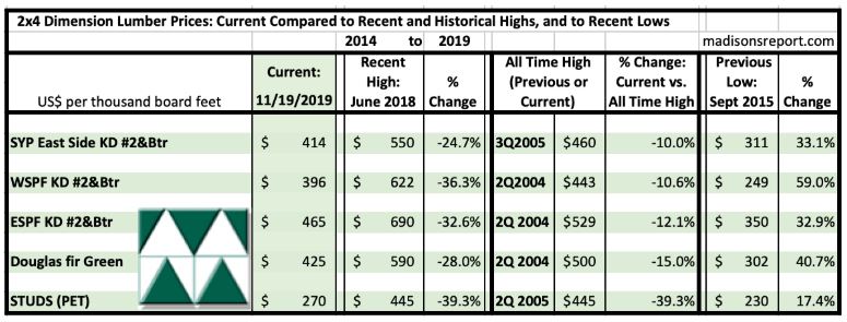 current November 2019 benchmark dimension softwood lumber 2×4 prices