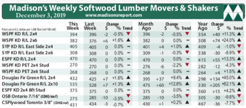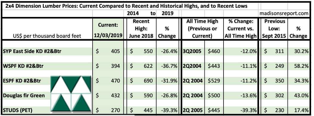 current November 2019 benchmark dimension softwood lumber 2×4 prices