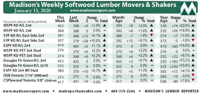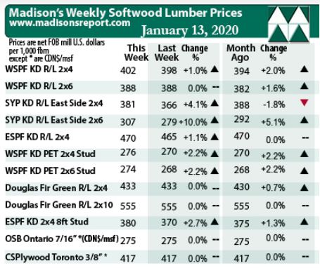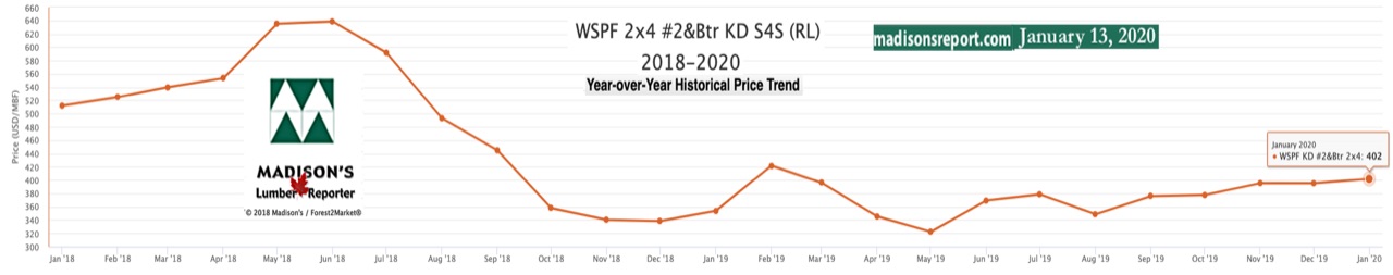 current Jan. 2020 benchmark dimension softwood lumber 2×4 prices