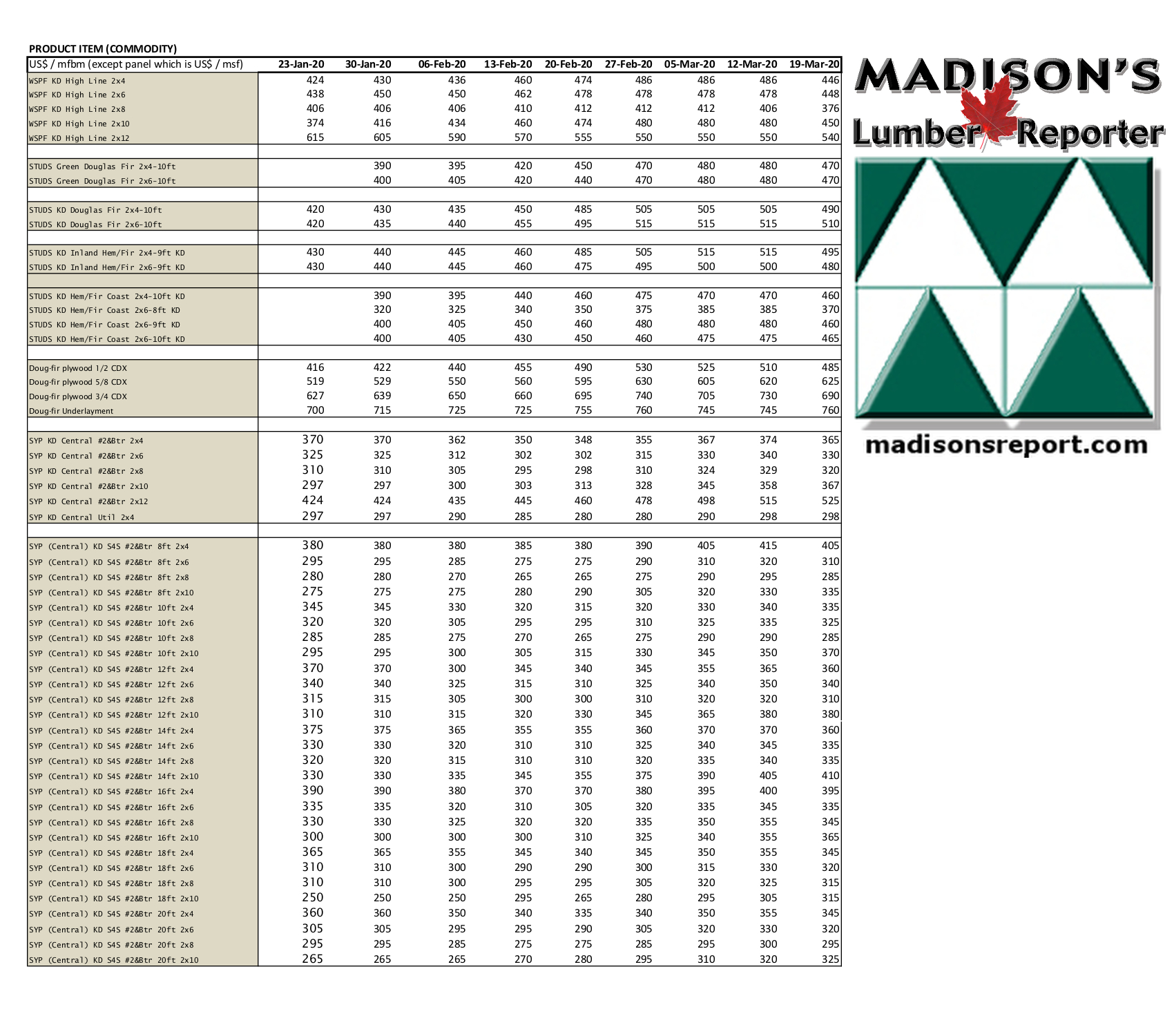 U.S. softwood and panel markets - week 12, 2019 ( March