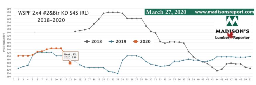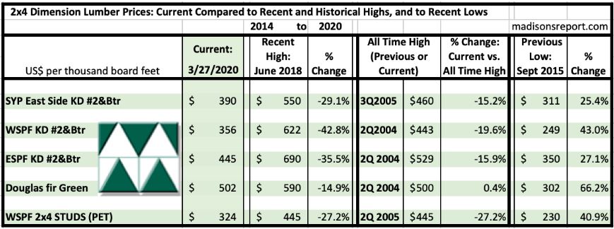 current March 2020 benchmark dimension softwood lumber 2×4 prices