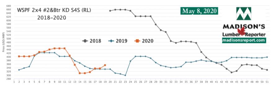 current May 2020 benchmark dimension softwood lumber 2×4 prices compared