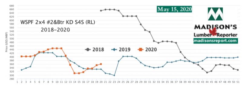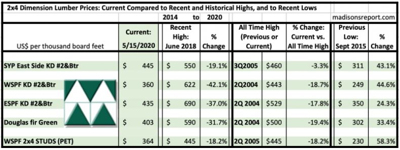 current May 2020 benchmark dimension softwood lumber 2×4 prices compared